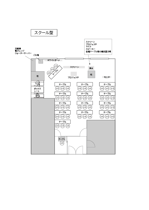 プロジェクタ(単焦点型)、スクリーン(100インチ)、テレビモニタ(50インチ)、ホワイトボード、マイク(ワイヤレス2本、有線1本)、スピーカー、演台、Wi-Fi、冷蔵庫、電子レンジ、電源タップなど、すべての設備を無料で利用できます。